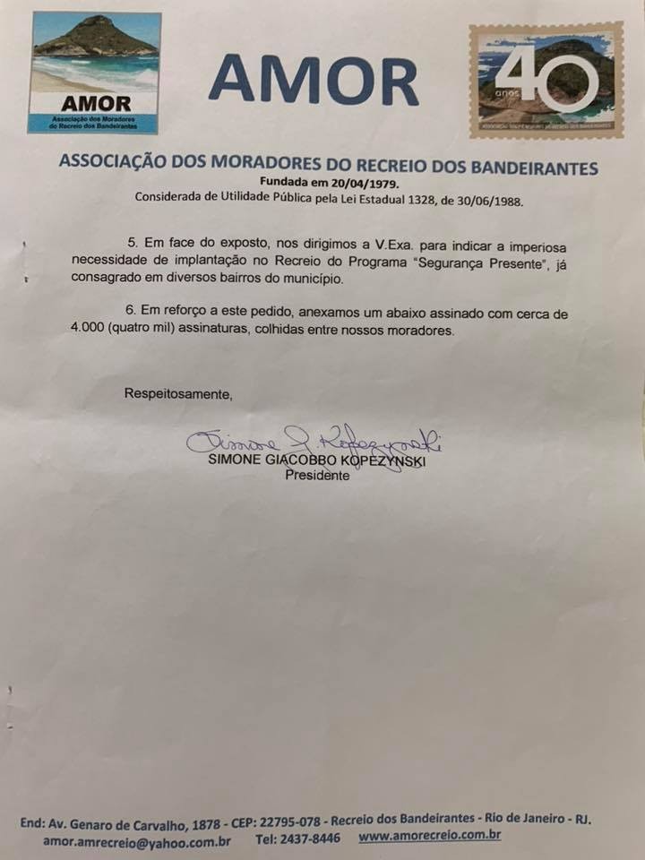 Na ocasião, foi entregue um Ofício da AMOR solicitando a instalação do Programa em nosso bairro, e um abaixo-assinado, composto de mais de 4000 assinaturas, colhidas pela equipe do Deputado.
