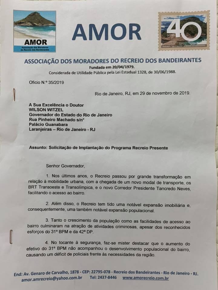 O Programa Recreio Presente, tão desejado pelos moradores, se tornará realidade. Foi alvo de inúmeros pedidos por parte dos moradores do Recreio dos Bandeirantes, e foi prometido pelo Governador Wilson Witzel à nossa Presidente, bem como ao Deputado Carlo Caiado, durante o lançamento do Programa Barra Presente.