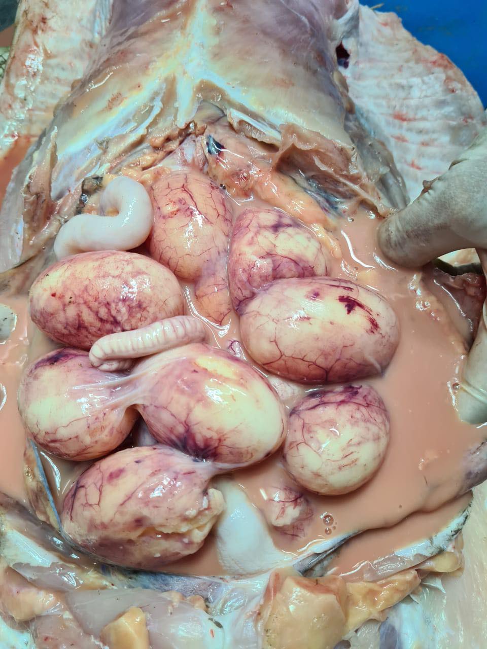 Na Imagem - Causa da morte: Celomite por gema. Fêmea com ovo que provavelmente brigou, quebrou alguns ovos no abdômen, esses vazaram para a cavidade que provocaram a inflamação.